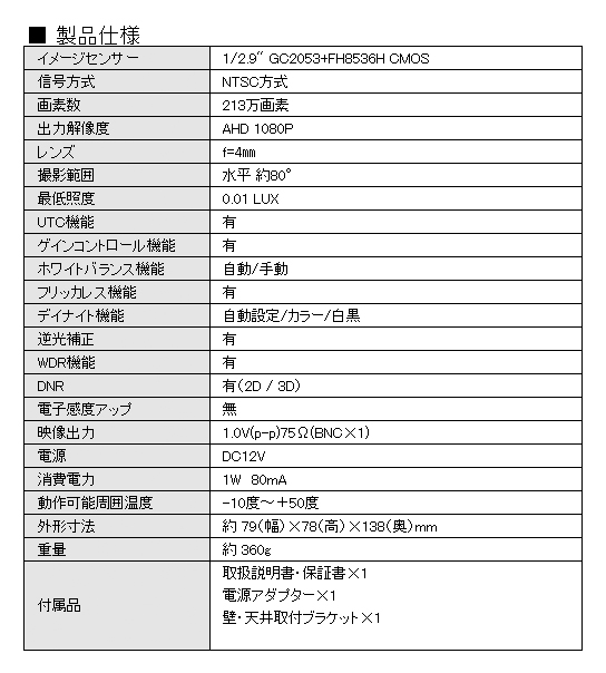 【CT-AHD530】213万画素 SONY STARVIS 左右撮影80°高感度カメラ(f=4mm)