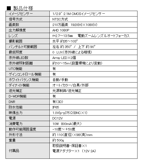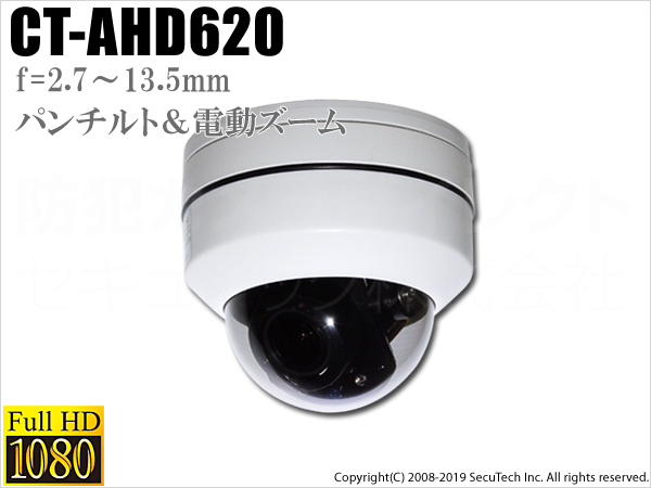 【CT-AHD620】210万画素 フルHD 電動ズーム 左右上下操作可 PTZドーム AHDカメラ(f=2.7~13.5mm)