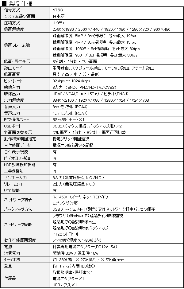 【CT-SR108】H.265+ 4MP・5MP対応 AHD/HD-TVI/CVBS 8chデジタルレコーダー(HDD1~8TB選択)