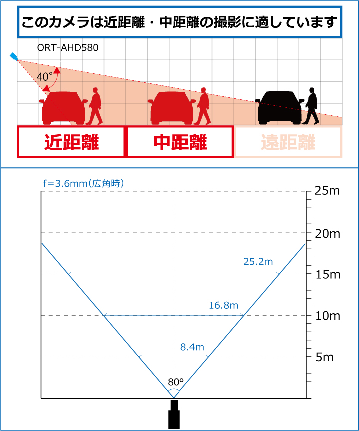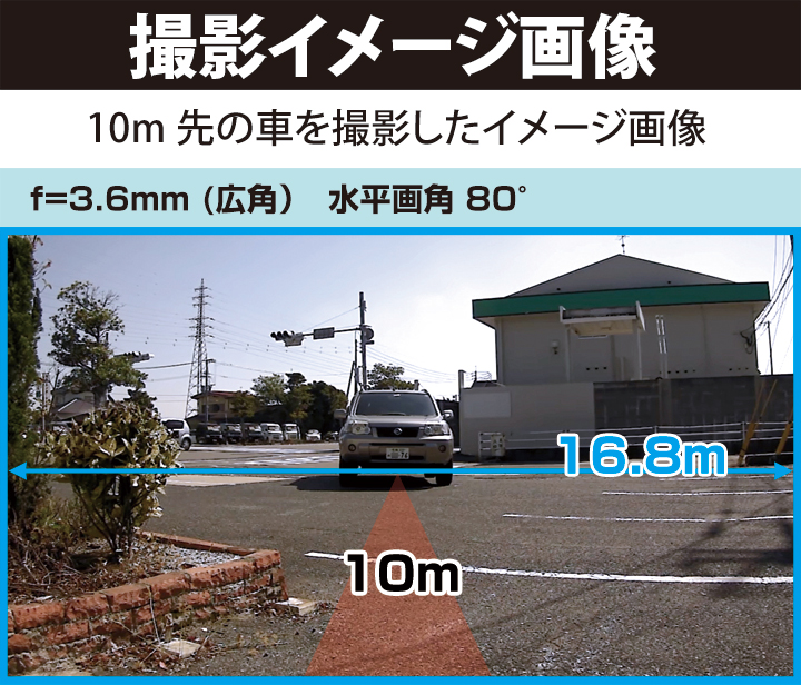 レンズと視野角: レンズは f=3.6mm の広角撮影に対応しています。