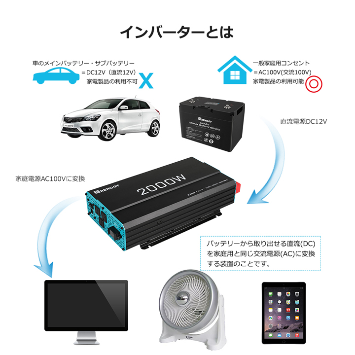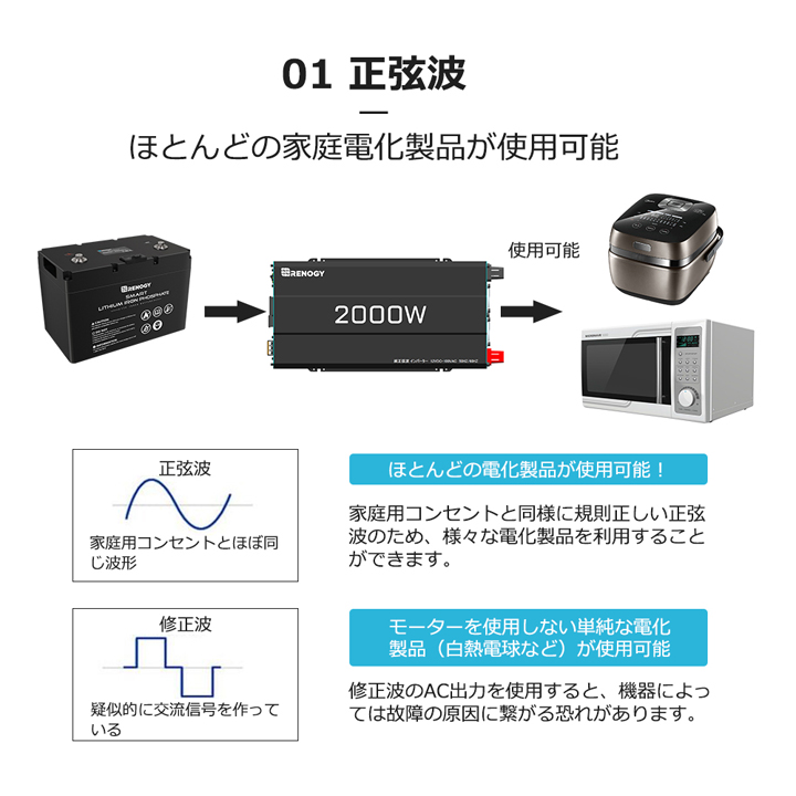 【RIV1220P2-10S】レノジー RENOGY インバーター 正弦波 2000W 50/60Hz切替 最大3000W 日本電化製品向け USB出力 DC AC (返品不可・代引不可)