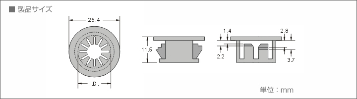 通線用穴の断面に取付けて、配線を保護しながら簡易固定できるブッシングです。