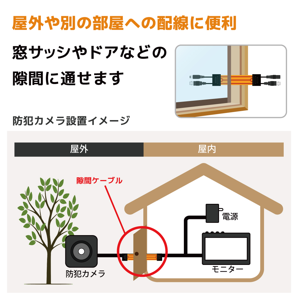 ●窓越し防犯カメラの配線を扉や窓の隙間から行う場合の配線セット