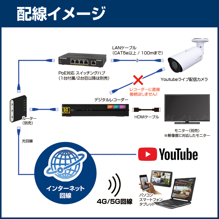 防犯カメラ1~4台セット【セット404-LIP】4chデジタルレコーダーとYoutubeライブ配信カメラ追加オプションセット(HDD1~10TB選択)
