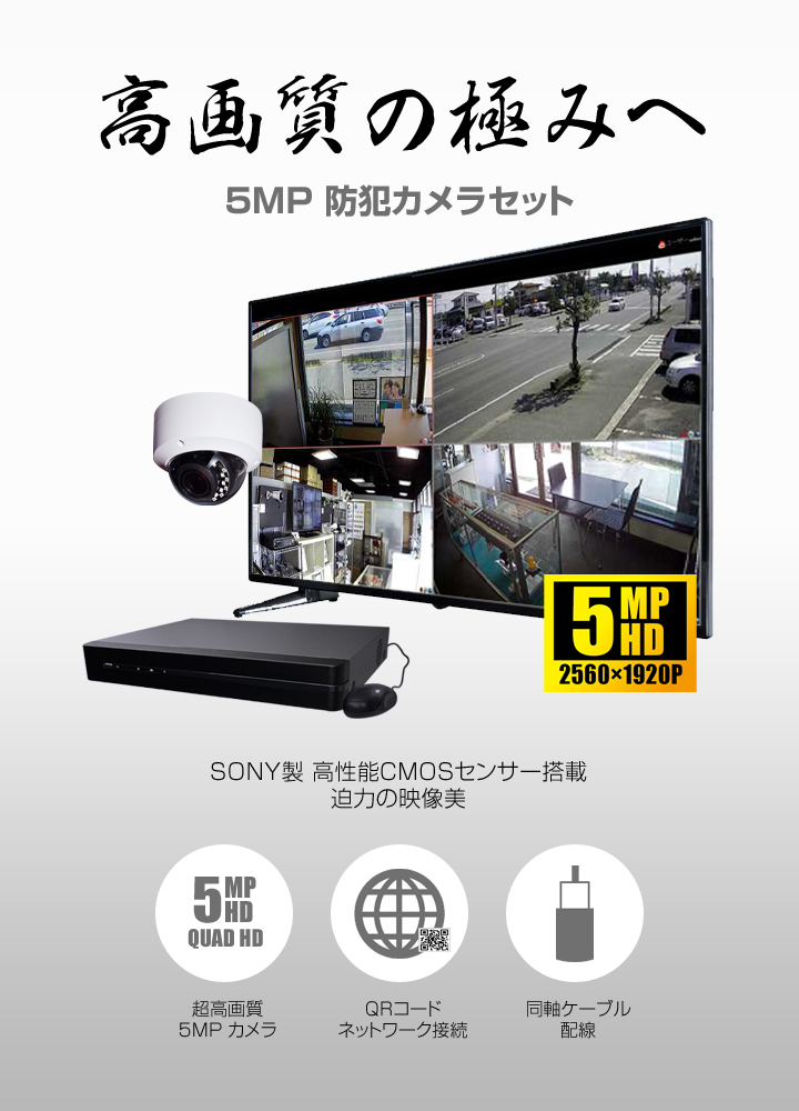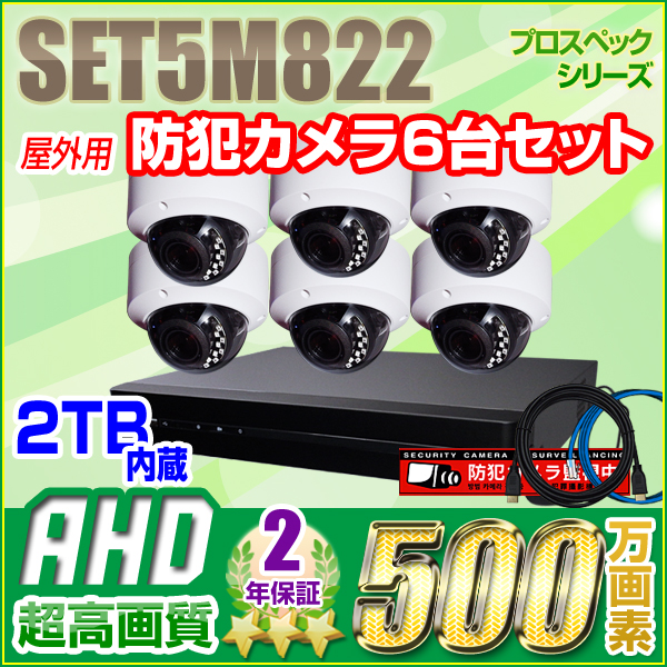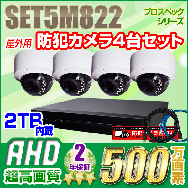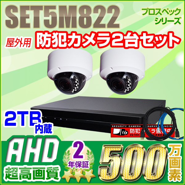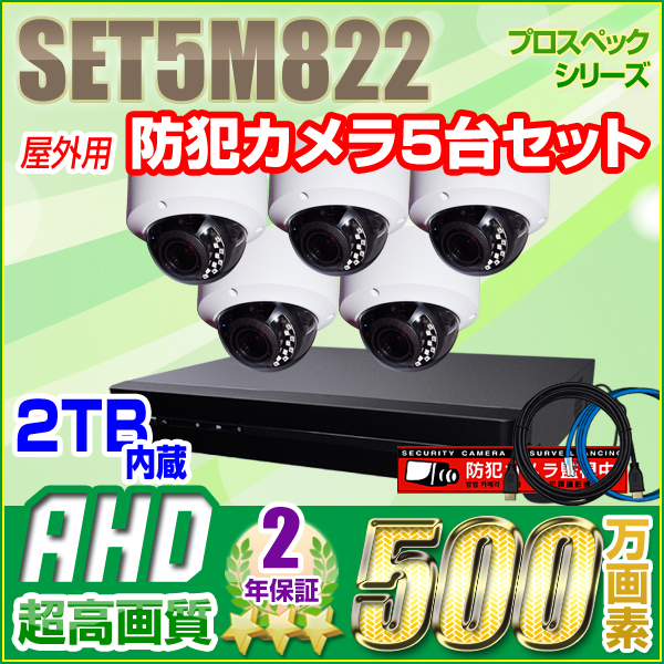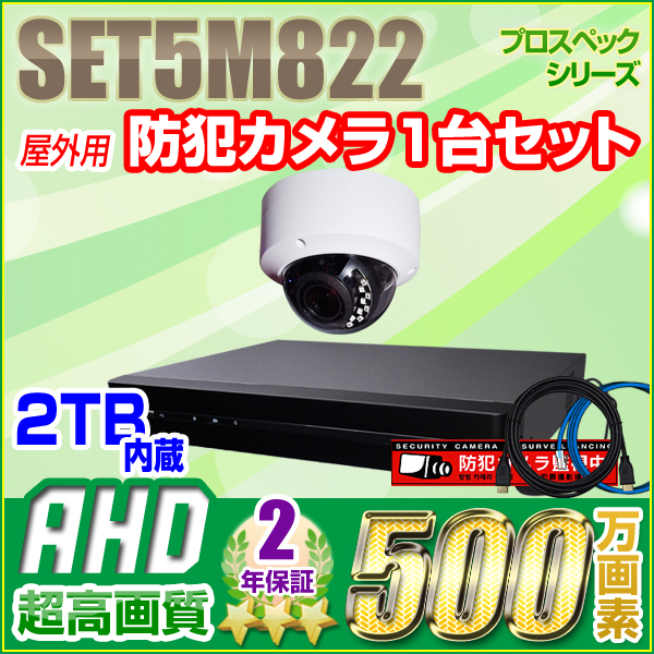防犯カメラセット・監視カメラセット【セット5M822】 5MP画質AHDカメラ1台と8chデジタルレコーダーセット(2TB内蔵)