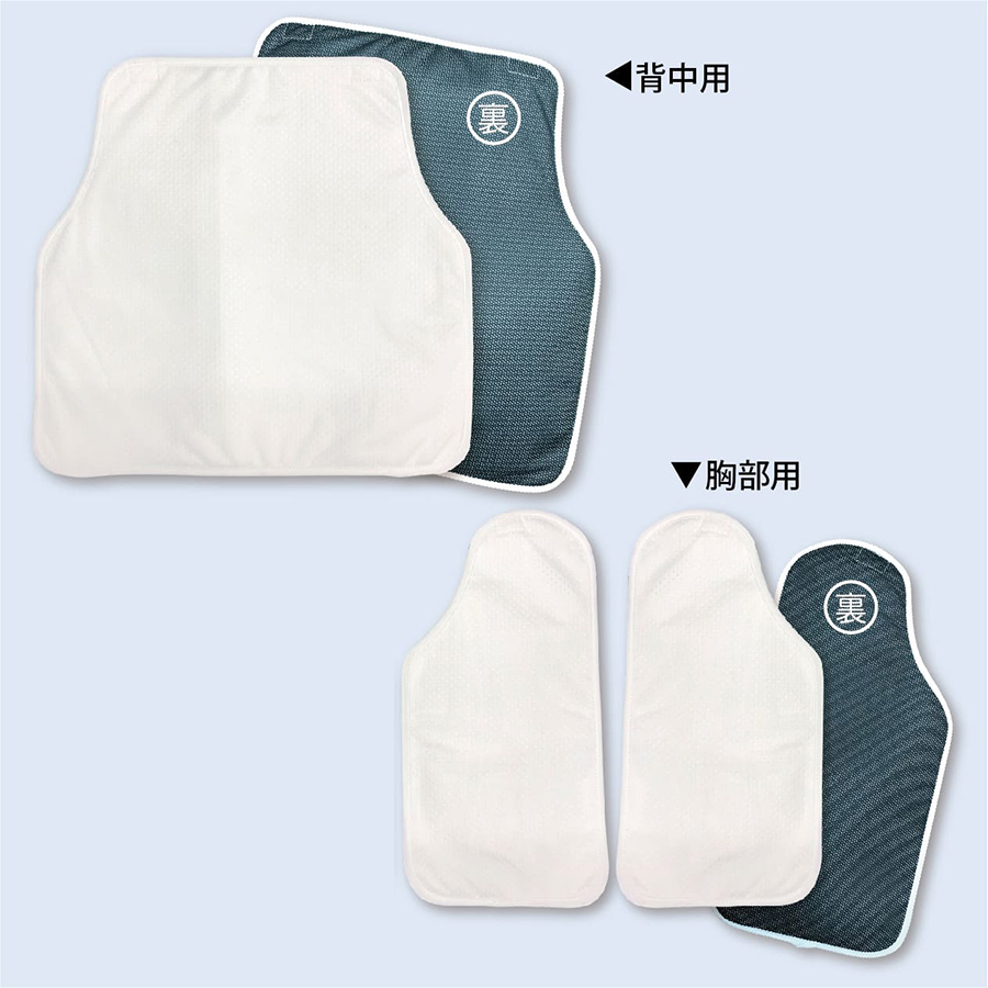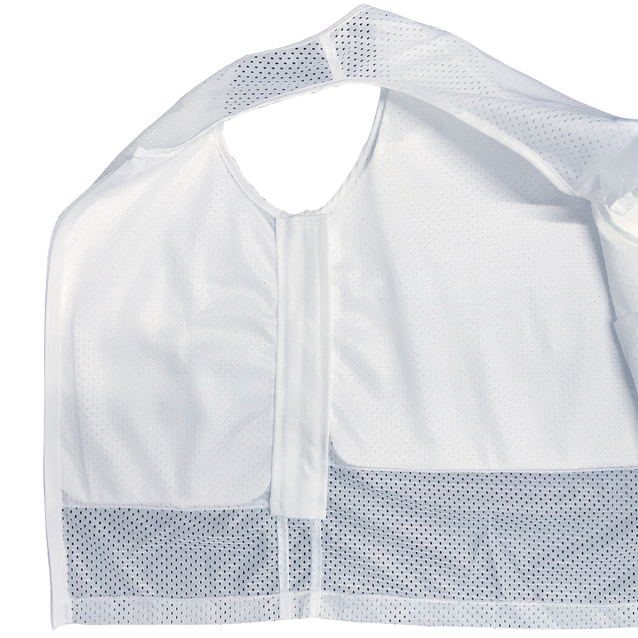 ベスト全体は、抗菌防臭・吸水速乾性のあるメッシュ生地を使用。通気性を良くし、