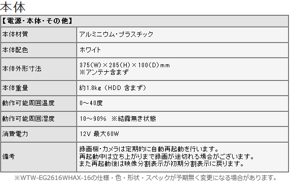 【WTW-EG2616WHAX-16】 IPカメラシリーズ用 大型16インチディスプレイ一体型ネットワークレコーダー 16chモデル(2~8TB選択)(代引不可・返品不可)