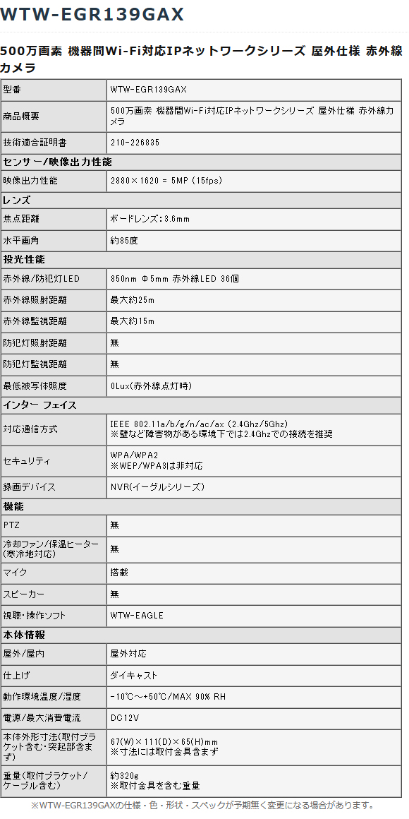 【WTW-EGR139GAX】 500万画素 機器間Wi-Fi対応IPネットワークシリーズ 屋外仕様 赤外線カメラ(代引不可・返品不可)