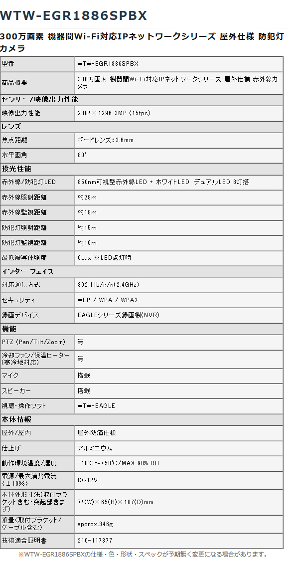 【WTW-EGR1886SPBX】 300万画素 機器間Wi-Fi対応IPネットワークシリーズ 屋外仕様 防犯灯カメラ(代引不可・返品不可)