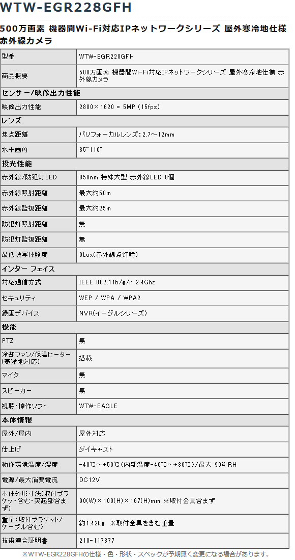 【WTW-EGR228GFH】 500万画素 機器間Wi-Fi対応IPネットワークシリーズ 屋外寒冷地仕様 赤外線カメラ(代引不可・返品不可)