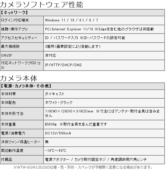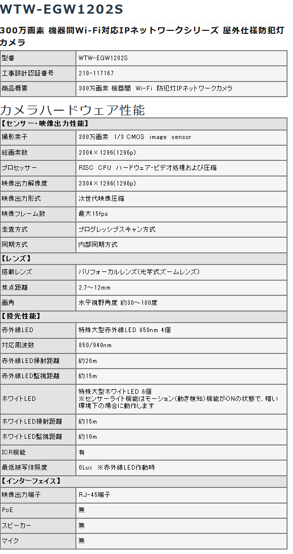 【WTW-EGW1202S】 300万画素 機器間Wi-Fi対応IPネットワークシリーズ 屋外仕様防犯灯カメラ(代引不可・返品不可)