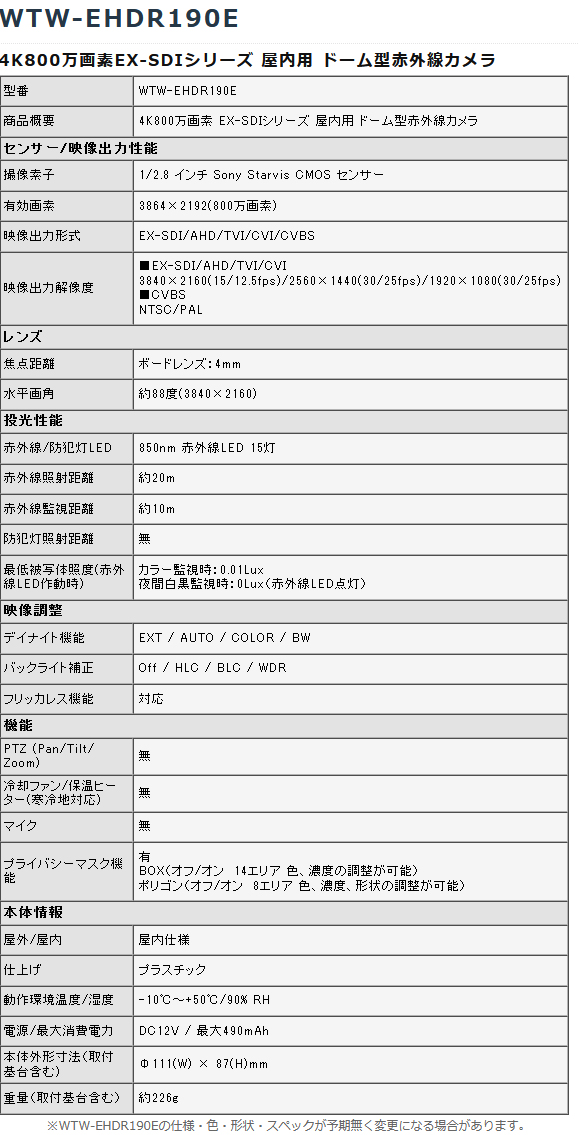 【WTW-EHDR190E】 4K800万画素EX-SDIシリーズ 屋内用 ドーム型赤外線カメラ (代引不可・返品不可)