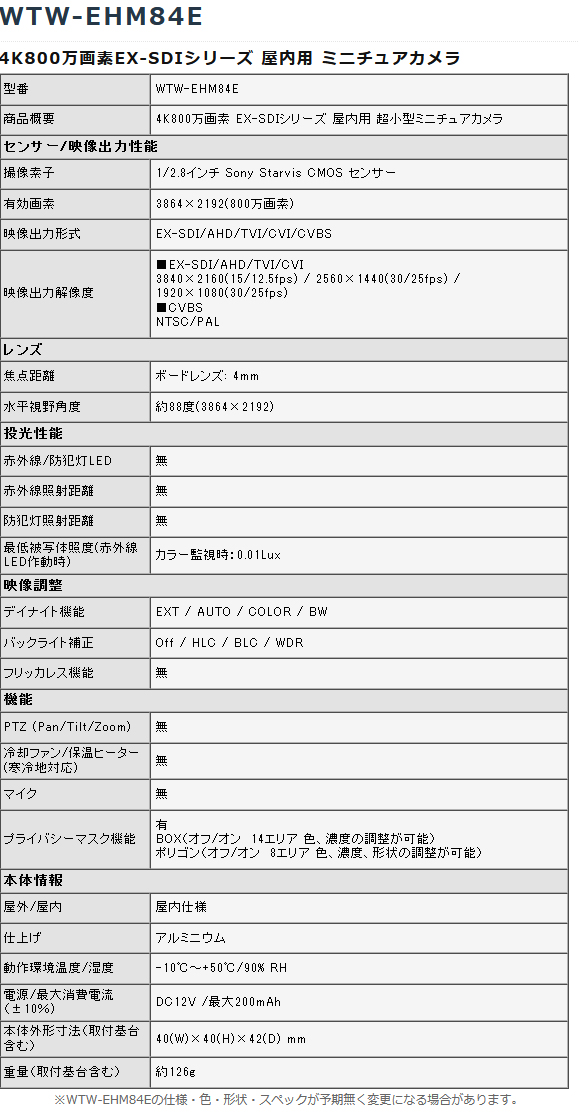 【WTW-EHM84E】 4K800万画素EX-SDIシリーズ 屋内用 ミニチュアカメラ (代引不可・返品不可)