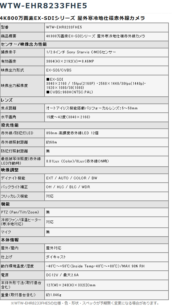 【WTW-EHR8233FHE5】 4K800万画素EX-SDIシリーズ 屋外寒冷地仕様赤外線カメラ (代引不可・返品不可)